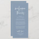 Teilen Sie die Liebe und zeigen Sie Ihre Wertschätzung für Ihre Gäste, wenn sie sich an ihrem Platz und lesen Sie dieses personalisierte bezaubernde staubblaue Thema danke Ihnen Platzkarte (Willkommen und danke). Es ist eine wunderbare Art, Ihre Feier zu starten! Diese Karte ist sicher, den Ton für ein unvergessliches Ereignis Set. Die Dankeschön-Karte bietet modernes Design-Drehbuch-Thema, das Ihrem Fest eine Touch zeitloser Eleganz verleiht. Designed by TeeshaDerrick