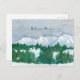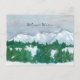 Willkommen Winter Postkartengrüße mit einem Winterblick inspiriert von Rocky Mountains und Wald unten mit Schneeschichten und stürmisch grauem Himmel über der Hand mit Aquarell.