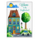 Eine perfekte Weise, neue Nachbarn zur Nachbarschaft mit diesem hellen und netten Entwurf eines hohen Aquarellhauses mit einer schwarzen Miezekatze zu begrüßen, die auf das Dach sitzt.