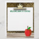 Niedliche Briefkopplerei auf einem goldenen Clip aus goldfarbenem Damaskettapete, auf dem "Welcome Back To School!" in grünem Text steht. Oder einfach den Text ganz durch Löschen verlassen. Ein roter Apfel mit grüner Blattanzeige auf einem Holzschreibtisch befindet sich in der unteren Ecke. Viel Platz zum Schreiben später. Eine tolle Geschenkidee für Lehrer, Ärzte, Krankenschwestern, Gesundheitsfachleute, etc. Denken Sie daran: "Ein Apfel am Tag, behalte den Arzt weg!"