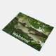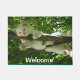Ein weißes Kätzchen auf einem Baumzweig inmitten üppiger grüner Vegetation. Das Fell des Kätzchens ist rein weiß und kontrastiert mit seiner rosa Nase und den Pfoten. Seine Augen sind auffallend gelb. Das Kätzchen befindet sich auf einem robusten, braunen Zweig, der von Blätter umgeben ist und einen natürlichen Rahmen schafft. Das Wort "Willkommen" wird in fett- und weißen Buchstaben am unteren Rand des Bildes geschrieben. Die Beleuchtung ist sanft und natürlich, was die Kätzchen und das Grün der Blätter unterstreicht. Die Komposition ist ausgeglichen, das Kätzchen als Mittelpunkt, umgeben von den natürlichen Elementen des Baumes.