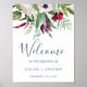 Dieses tropische Brise Begrüßungspakat ist perfekt für eine elegante Frühlings- oder Sommerhochzeit. Das Blumendesign mit roten, bordeauxroten, rot-weißen Blume auf einem Eukalyptusbett im Wasser und tropischer Vegetation mit entspanntem hawaiianischem Ambiente. Passen Sie das Poster mit dem Namen der Braut und Bräutigam und dem Datum der Hochzeit an.