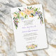 Le haut de cette jolie faire-part de mariage est agrémenté d'une image de demi-couronne fleurie couleur aquarelle. Les couleurs utilisées comprennent la mandarine, l'or, le jaune, le bleu, le violet, le vert et plus. Le bas de l'invitation a une image florale similaire. Votre texte personnalisé est en gris moyen et bleu violet au centre. Les images et le texte sont placés sur un élégant arrière - plan blanc, et le dos de l'invitation est également blanc. Beau, et les couleurs de cette invitation sont appropriées du printemps à l'automne.