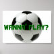 ein will Poster eines Fußballballs spielen mit "WANNA' PLAY?", der darüber läuft.