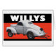 Image retouchée par Digital d'un coureur 1941 d'entrave de Willys sur l'arrière - plan de rouge et de noir avec le grand mot blanc "WILLYS".