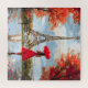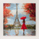 Eine anmutige Frau mit einem roten Schirm wandert in einer sanften Herbstbrise zum Eiffelturm. Romantischer Pariser Charme in leuchtenden Rot- und Goldtönen.