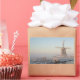 Rechteckiger Aufkleber mit einer traditionellen niederländischen Windmühle bedeckt im Schnee in einer ländlichen Landschaft in Aarlanderveen, die Niederlande, im Winter im warmen Licht des frühen Morgens am Sonnenaufgang. Eine große Andenken!