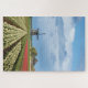 Das Puzzle aus dem Vertikalen Foto mit einer Windmühle und gelben und roten Tulpen unter einem bewölkten Himmel auf dem niederländischen Land an einem schönen Frühlingstag in der Bulb Region, den Niederlanden.