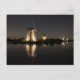 Postkarte einer Landschaft mit mehreren Windmühlen, nachts beleuchtet, mit Reflexion im stillen Kanalwasser in Kinderdijk, Niederlande.
