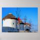 Windmühlen aus dem 16. Jahrhundert und klassische weiß getünchte Gebäude liegen in den labyrinthartigen Straßen von Mykonos Island, Griechenland.