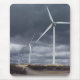 Windkraftanlagen gegen einen drastischen Hintergrund der dunklen Wolken.
