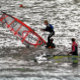Ein Design der Windsurfer im Meer in Aberdyfi Wales UK.
