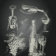 Chalk drawing on a blackboard of wine-related items, including a corkscrew, a hand pouring wine from a bottle into a glass, a bunch of grapes, a wine bottle, two wine glasses, and a piece of cheese. The drawing is done in a simple, sketchy style, with white lines on a black background. The word "Wine" is written in cursive in the center of the drawing.