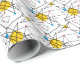 Schwarze lineare Winkel und Kreise in den Primärfarben Rot, Gelb und Blau bilden das zeitgenössische Retro-Muster, das diese Geschenkpackung schmückt und an das moderne Design des Mitteljahrhunderts und das Atomzeitalter der 1950er und 1960er Jahre erinnert.