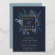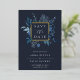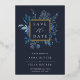 Notre mariage Winter Azure enregistrer la date encadre les mots "enregistrer la date" avec une élégante bordure carré de feuillage d'aquarelle luxuriante dans les tons vinicoles de bleu poussiéreux, avec de véritables garnitures en feuille d'or sur un arrière - plan bleu minuit. Un regard moderne et élégant sur la tendance botanique pour les mariages d'hiver ou de printemps en bleu et blanc frais.