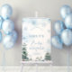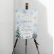Winter Wonderland Baby Dusche Willkommensplakat mit blauen Schneeflocken und Kiefernbäumen.