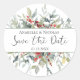 Dieses Design zeigt eine Darstellung des grünen Blattwerks und der roten Beeren im Aquarellstil. Personalisieren Sie mit Ihren Namen und Hochzeitstermin. Text "Save the Date" wird in einem Script-Schriftart geschrieben.
