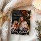 Einfache Weihnachtskarte mit niedlichem Foto und weißem kalligraphischem Schriftart, ideal für dunkle Bilder.