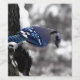 Schönes Song Vogel Foto in Ringtown Pennsylvania, Nordamerika aufgenommen. Die Federn sind blau und schwarz auf diesem seltsamen Vogel. Ein Winterschneesturm hat die Bäume mit dem weißen Flussufer links, wo die blaue Jay gerade herumhängt.
