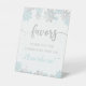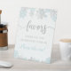 Moderne Babydusche bevorzugt Podestschild mit Motiven der winterblauen und silbernen Glitzer-Schneeflocken mit dem Text "favors".
