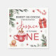 A charming winter-themed birthday napkin design featuring a red cocoa mug with whipped cream and cinnamon, festive candy canes, snowflakes, pine greenery, and a holiday gift illustration. Perfect for winter or Christmas first birthday parties, this warm and playful layout adds a seasonal touch to your table décor. Ideal for girls’ first birthdays and cozy holiday celebrations.