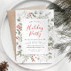 Elegante Feiertagsveranstaltung mit gerahmten Party-Details mit roten Wasserfarben-Holly-Beeren, Eukalyptus-Blätter und üppig grünem Blattwerk. Personalisieren Sie die Vorderseite der botanischen Weihnachtsfeiertage mit Ihren Party-Details.