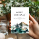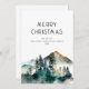 Winterwaldname Frohe Weihnachten. Verfügbar in digitaler Form und gedruckt. Ein festlicher Wasserfarbenwald grenzt an den unteren Rand, unterhalb der Worte. Individuell auf Ihre Bedürfnisse zugeschnitten.