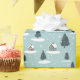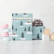 Charmantes Wintermuster mit gemütlichen Hütten, schneebedeckten Bäumen und zarten, fallenden Schneeflocken auf weichem blauen Hintergrund. Ideal für saisonale Designs und Urlaubsträume.