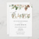 Baby Sprinkle Einladung mit "oh baby" in eleganten goldenen Buchstaben mit einer Grenze von immergrün und pinecones. Ideal für ein winterliches Baby. Passen Sie Ihre Daten an.
