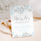 Winter Einladung zum ersten Geburtstag in Onederland mit blauen und silbernen Schneeflocken.
