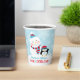 Winterwunderland "ONEderland" Erstgeburtstag Party Becher Design bietet einen glücklichen Schneemann und einen niedlichen kleinen Pinguin mit warmen Hüten und einem Schal und einem winterlichen Hintergrund mit einem Muster von Schneeflocken. Eisblau, Türkis, Rot, Weiß und Sondertext.
