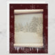 Winter Pergament-Illustration mit alter Papierrolle mit schneebedeckter Landschaft und Schnee- und Eiskunstdekoration auf dunkelrotem Hintergrund mit Schneeflocken.