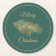 Weihnachts-Party-Untersetzer aus dunklem Kelly-Grün mit goldfarbenem Akzent. Die goldene Grafik eines Kiefernkonus auf einem Kiefernzweig schmückt die Mitte. Frohe Weihnachten, in goldenem Tontext, kann personalisiert sein, zu lesen, was Sie gewollt haben. Die passenden Vorräte und Einladungen für Feiertage stehen zur Verfügung.