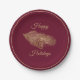 Elegante bordeauxfarbene Urlaubspapier-Teller mit goldfarbenem Klingelrand und goldener Tongrafik von Kiefernzapfen und Kiefernzweig, in der Mitte. Happy Holidays in goldfarbenem Text ist bereit, mit Ihrer Nachricht zu personalisieren.