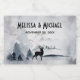 Hochzeitsflaschen-Etiketten mit einem Aquarellbild mit einem Rentier aus schwarzer Silhouette, der unter einigen Kiefern stehend ist. Graues Schwarz-Weiß-Farbschema mit neutraler Farbe.