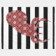 Eine Decke, die ein Rotwild mit weißem Schneeflocke- und Zickzackmuster über einem gestreiften Schwarzweiss-Hintergrund kennzeichnet.