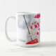 Maßgeschneiderte Tasse mit niedlichem Winterschneemann mit Schneeschuhen und "Frohe Weihnachten" in Roter Glitzer Schrift Typografie.