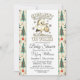 Eine charmante Baby-Dusche mit Stork-Ankündigung auf festlichem Wintergebirge mit Tannenbäumen in Erwartung einer kleinen Schneeflocke! Sie können diese Einladung mit Ihren eigenen Daten personalisieren!