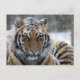Ein schneebedeckter Tiger blickt in die Ferne.