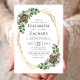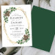 Dieses Design zeichnet sich durch einen geometrischen Rahmen in Gold aus, der mit Aquarelltonnen und Wintergrün, darunter Eukalyptus und heilige Blätter, dekoriert ist. Ideal für eine Winter- oder Weihnachtsfeier. Die Rückseite der Karte ist ein passender Schatten von solidem Grün.