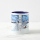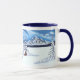 Eine Tasse mit einer wunderschönen Winterlandschaft inklusive Berg, rustikaler Hütte und Evergreens nach einem starken Schneefall. Bild und Text können personalisiert sein. Original-Kunstwerk von W.B.