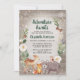 Eine süße, rustikale Babydusche mit niedlichen Wasserfarben von Waldtieren, Blumen und Grünpflanzen und einem Overlay von Goldstars und Schneeflocken. "Adventure Awaits" und der Name der künftigen Mutter sind in einem waldgrünen Skript geschrieben.