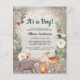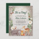 Kostengünstige rustikale Winter Babydusche mit niedlichen Wasserfarben von Waldtieren, Blumen, Grün und einem Overlay von goldenen Sternen und Schneeflocken. "Es ist ein Junge!" oder "Es ist ein Mädchen!" und der Name der künftigen Mutter ist in einem grünen Skript geschrieben.