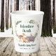 Rustikale Baby-Duschtassen mit Aquarellbildern von niedlichen Waldtieren (Bär, Fuchs, Reh und Eule), Blumen, Grünpflanzen und goldenen Sternen und Schneeflocken. "Adventure Awaits" und der Name der künftigen Mutter sind in einem dunkelwaldgrünen Skript geschrieben.