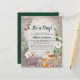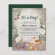 Günstige rustikale Winterdusche mit niedlichen Wasserfarben von Waldtieren, Blumen, Grün und einem Overlay von Goldstern und Schneeflocken. "Es ist ein Junge!" oder "Es ist ein Mädchen!" und der Name der künftigen Mutter ist in einem grünen Skript geschrieben.