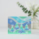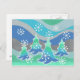 Eine moderne, stilvolle Winterlandschaft mit mattierten Kiefern und glitzernden Schneeflocken. Postcard mit einem grünen, blauen, silbergrauen und weißen Design, das Sie individuell gestalten können, um Ihre eigenen Texte, Bilder und Ideen zu personalisieren. Ein digital verstärkter Bleistift, der von Jess Perry gezeichnet wird.