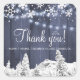 Editierbarer Text bevorzugt Aufkleber mit rustikalen weißen Schneeflocken, drei kleinen Herzen, einer Berglandschaft und binkelfarbenen Hängeleuchten mit einem weißen bearbeitbaren Dankeschön-Skript auf dunkelblau grauem Stallholzhintergrund. Ideal für Ihren Winter elegante rustikale saisonale Wunder thematische Hochzeit, Babydusche oder andere Anlässe.