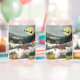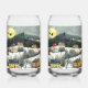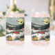 Der hübsche Winter kann Brillen mit dem Bild eines Landdorfes an einem schneebedeckten Tag mit Salzwasserhäusern in Rot und Gelb, die sich in der hügeligen Landschaft befinden. Gebirge erheben sich im Hintergrund und schaffen eine schöne, malerische Szene. Der Weihnachtsmann fliegt über den Himmel, schweigend gegen den Vollmond.