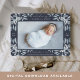 Elegante botanische Geburtsankündigung in schicken Blautönen mit einem Single voll bluten horizontalen oder landschaftsorientierten Foto mit Haufen von zarten staubblauen Aquarellfarben-Blätter und weißen Beeren an den Ecken, vor einem reichen marinen Hintergrund. Personalisieren Sie Ihre Daten mit dem Namen des Babys, den Geburtsstatistiken und einer persönlichen Nachricht, und fügen Sie drei zusätzliche quadratische Fotos hinzu.