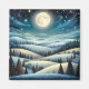 Eine ruhige Winterlandschaft entfaltet sich unter Vollmond-Glanz, mit sanften, schneebedeckten Hügeln, die von dunkelgrünen Bäumen übersät sind. Sterne blinken im tiefen Nachthimmel und fügen der friedlichen Szene eine magische Touch hinzu. Diese Fantasielandschaft besticht durch einen Vollmond, der eine im Winter verschneite Landschaft mit Hügeln, Bäumen und einem Sternenhimmel beleuchtet.